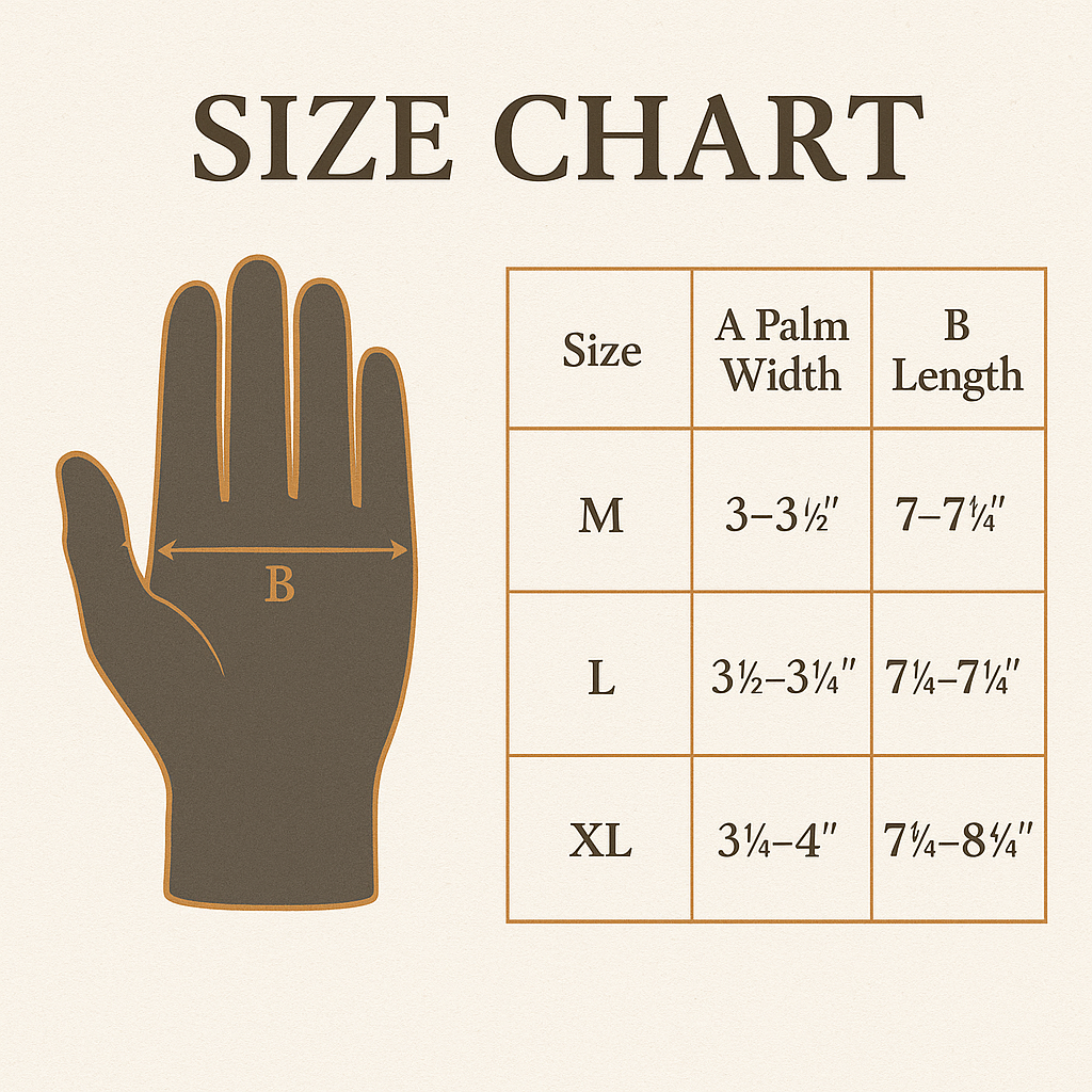 The size chart is shown in the last image of the product gallery. Use it to measure your hand width and length. If you’re between sizes, choose the larger one for a more comfortable fit.